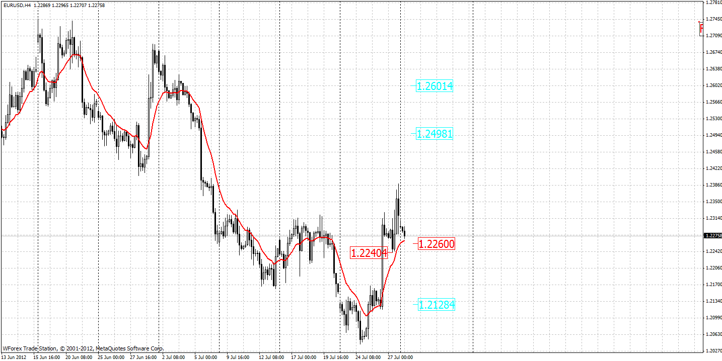 По евро, нужно дождаться выполнения условий – закрепление на Н1 ниже 2260, тогда можно встать в продажи до отметки 2128 (фиксация прибыли частичная с переносом в +1), либо, при НЕ пробое уровня 2240 – купить под этим уровнем (ниже на пунктов 30) и держать покупки до 1.25 и 1.26 (возможны доливы по тренду).